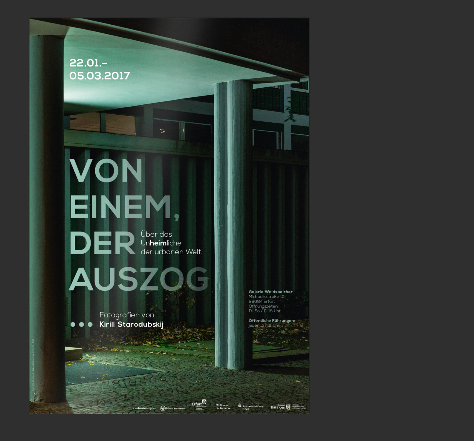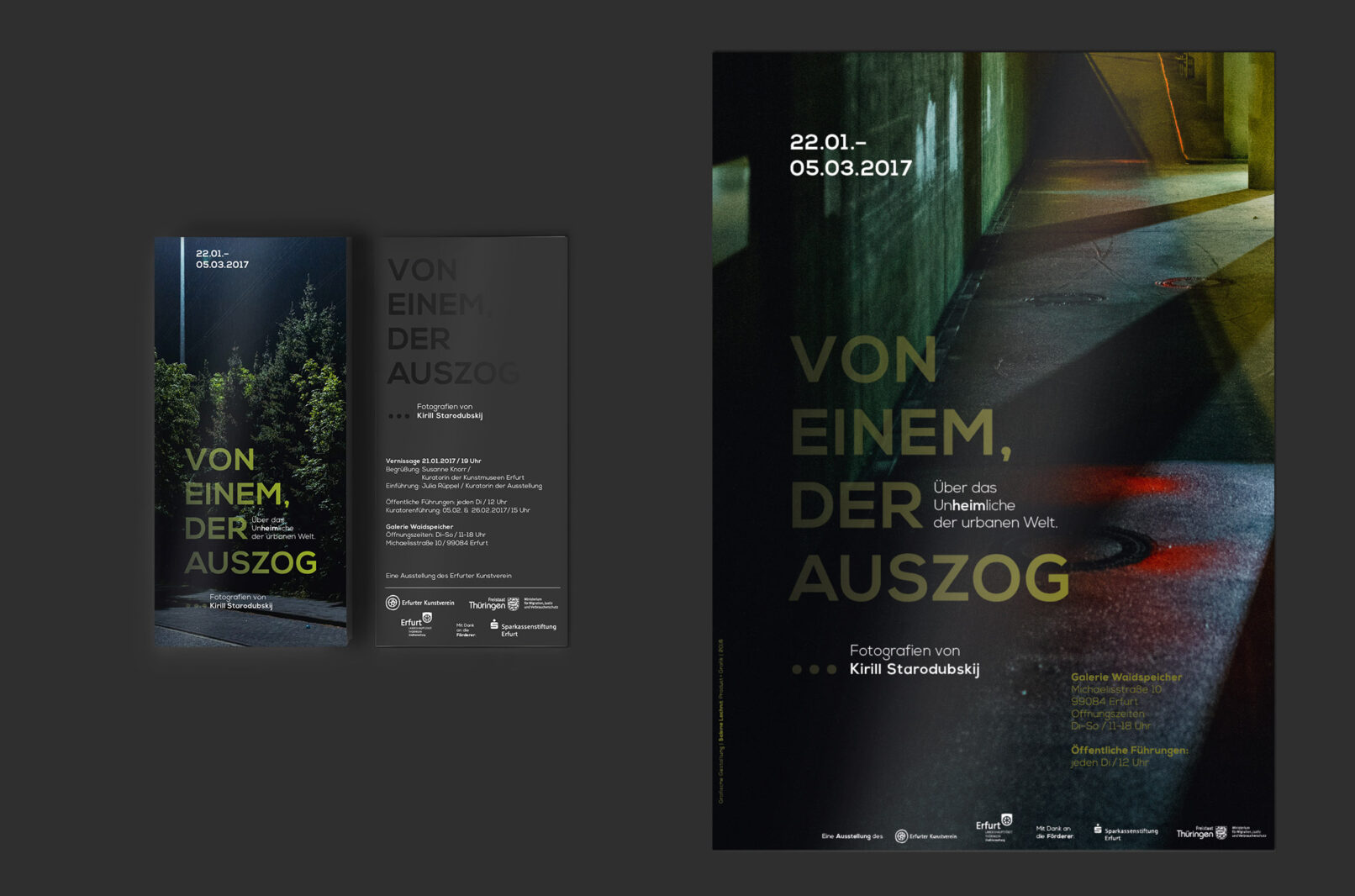 Neben Plakaten, Anzeigen, großformatiger Aussenwerbung und Einladungen für die Ausstellung in der Galerie Waidspeicher entstand auch ein umfangreicher Ausstellungskatalog. Jedes Medium ziert ein anderes Fotomotiv, der Farbverlauf des dort platzierten Ausstellungstitels wird jeweils in Richtung, Intensität und Farbton von der in der Fotografie eingefangenen Lichtsituation bestimmt.